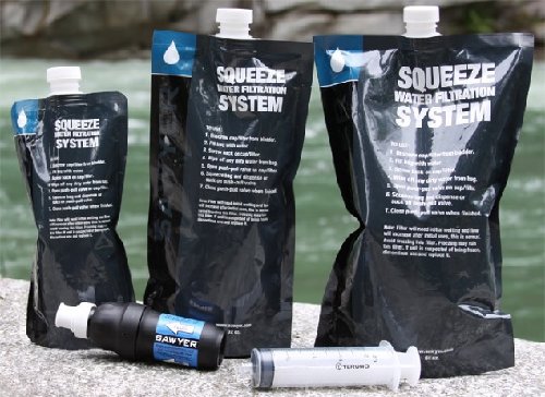 The new Sawyer Squeeze Filter is an exceptionally light and versatile water filtration system. With a total field weight of 3 ounces and the ability to roll up into a compact package, it hardly takes up space in your pack. Included with the filter are 3 pouches in 3 sizes: 0.5 liter, 1 liter and 2 liter that can be reused hundreds of times. To use, just fill pouches at a lake, stream or river; screw the filter directly onto the pouch and squeeze the bag of filtered water into a water bottle or container. You can also drink directly from the filter which has a built in push/pull cap for on/off functions. You can also attach the filter onto most threaded bottles including 2 liter soda bottles. Travel with the Sawyer Squeeze Filter when visiting areas where tap and bottled water are not entirely safe to drink. It is the perfect choice when hiking, hunting, camping, out on a canoe trip, or adventure travel trip.